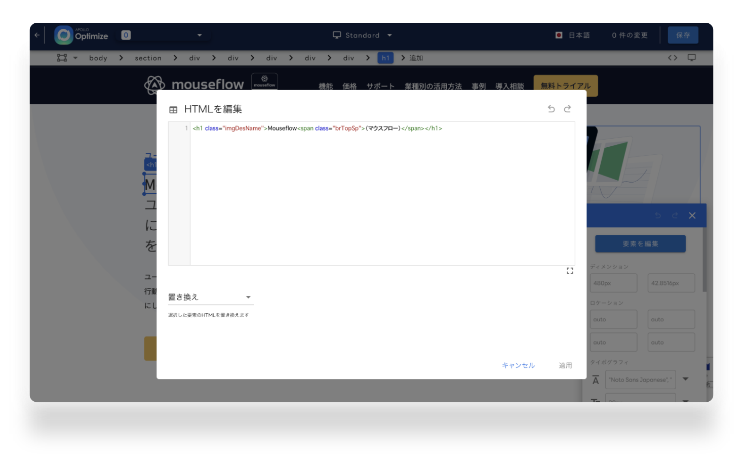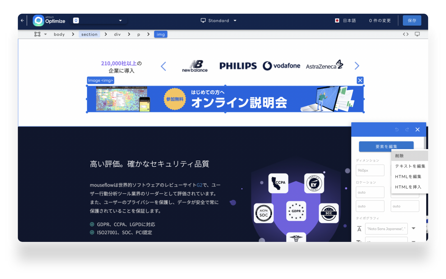 直感的にカンタン編集ビジュアルエディタで簡単に直感的に編集できることも特徴です。変更したい要素をカーソルで選択し、画像やテキストを変更します。